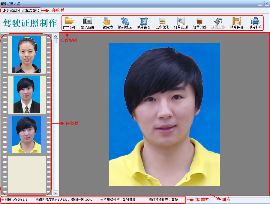 菜单栏包括系统设置和批量处理,系统设置包括证件规格设置、肤色参数设置和打印排版设置;批量处理包括批量证照制作 、批量背景替换和批量打印输出。