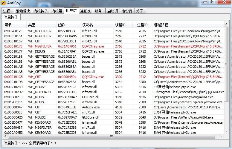 1.查看进程线程、模块、窗口、内存、热键、定时器、权限等信息;