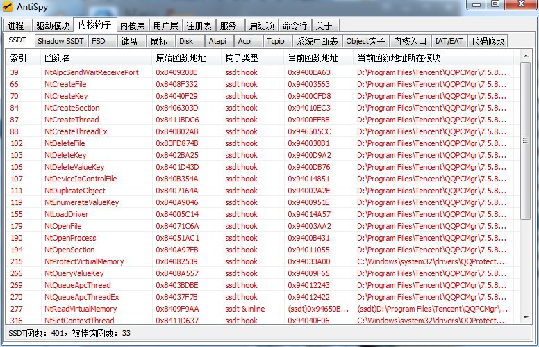 8.常见内核钩子的查看和恢复,包括SSDT、Shadow SSDT、FSD、键盘、鼠标、TCPIP、Classpnp、Atapi、Acpi、IDT、Object hook、内核入口等;
