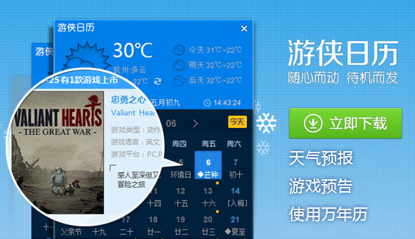 游侠日历是由游侠网官方出品的一款最实用的游戏日历,能够提供游戏预告,可以在日历上查看已经发行过的游戏,还提供万年历和天气预报等多种实用功能,游侠日历,随心而动,待机而发!