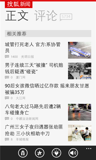 搜狐新闻客户端wp版,为用户提供第一手的新闻资讯,搜狐新闻拥有强大的媒体资源,搜狐新闻先知道,海量媒体等您来搜狐新闻是现在最流行的新闻类APP,是央视新闻独家合作伙伴。海量媒体账号等您关注,免费独家资源任您阅读。每天上班、下班、睡前用手机要做的三件事:刷微博、聊微信、看搜狐新闻客户端。