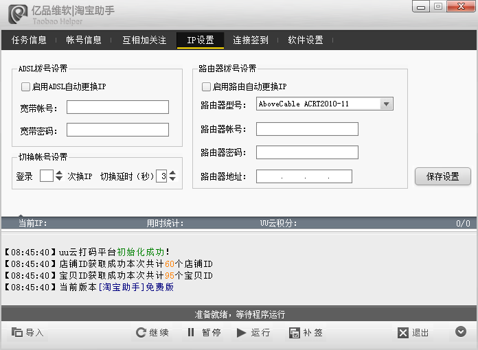 多帐号淘宝助手是一款多功能全自动帮助淘宝用户完成各种淘宝任务的一款辅助工具,可以每日自动一键完成淘金币任务、集分宝任务、淘宝抽奖等等,支持多帐号操作,适合那些拥有大量淘宝帐号的用户使用,工具功能齐全,十分智能,是淘宝达人必备工具!