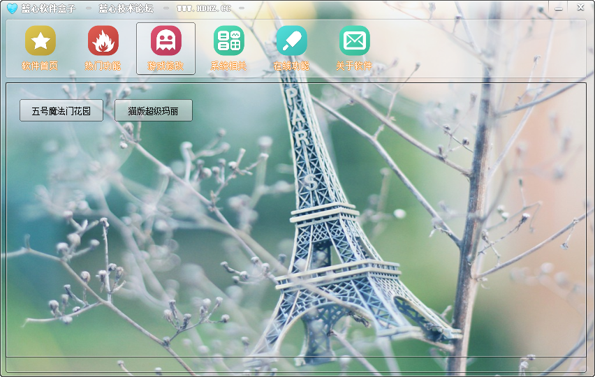 蓝心软件盒子是一款多功能软件盒子工具,主要提供一些热门实用工具、游戏修改工具、系统相关工具以及在线功能等等,集成的软件都是可用的,不需要用户为某个功能去下一个软件,让用户更加方便快捷操作!软件盒子帮你全部搞定!软件支持Windows32/64位所有系统。有需要的朋友可以下载试试!
