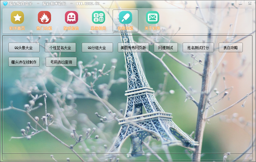 在线功能:QQ头像大全、个性签名大全、QQ分组大全、美图秀秀网页版、网速测试、姓名测试打分、表白攻略、藏头诗生成、号码吉凶查询