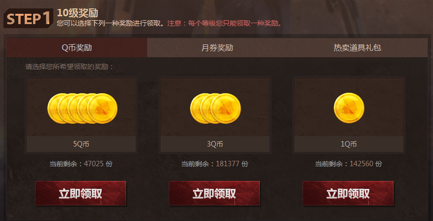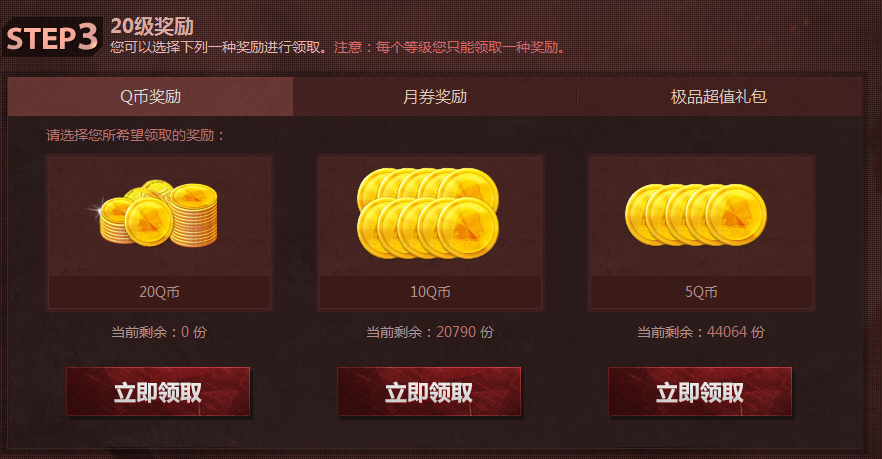您可以选择下列一种奖励进行领取。注意:每个等级您只能领取一种奖励。
