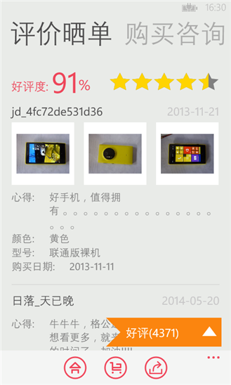 2、晒单、评价 在收到商品后,您可更方便、快捷的展示商品照片,分享商品的使用心得。