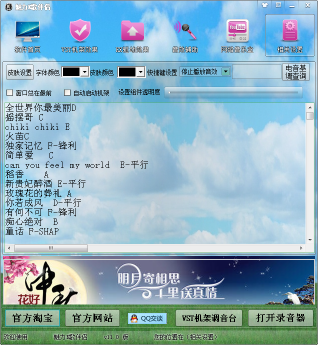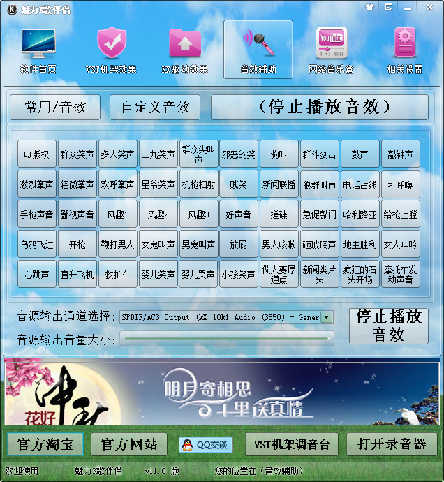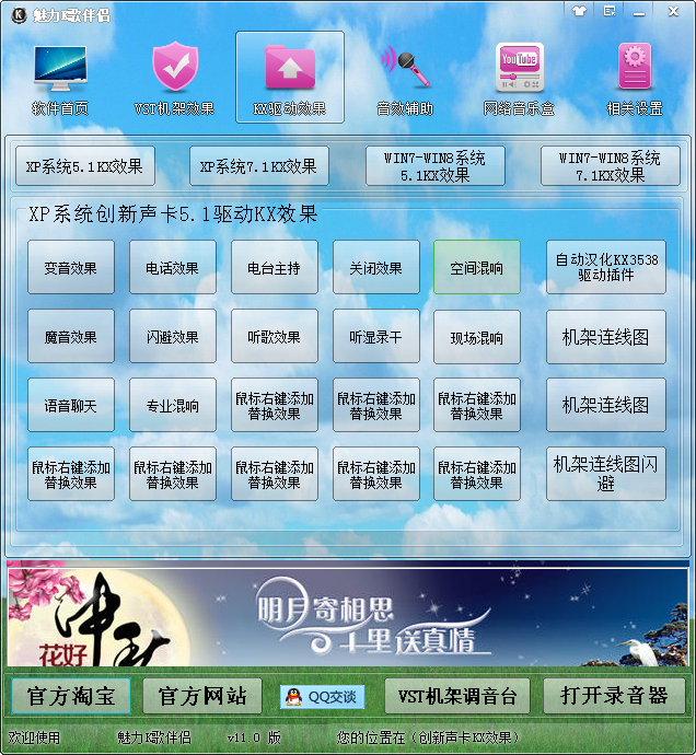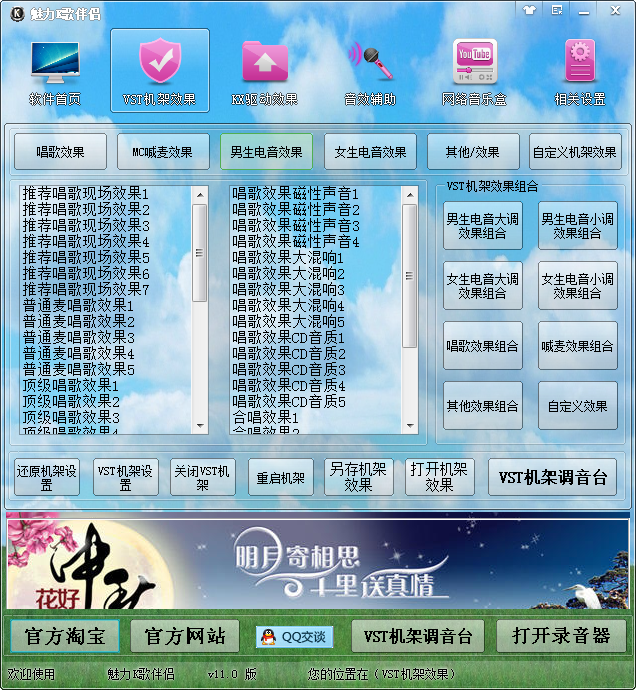 魅力K歌伴侣是一款用于网络视频直播、YY频道直播、视频聊天室、网络K歌、MC喊麦等地方使用的一款音效辅助软件。内置多种效果,KX驱动效果、VST机架效果;全部效果超过300个、网络DJ音乐超过七百首以上、VST效果支持声卡;创新7.1、5.1 外置声卡支持VST机架的均可使用。