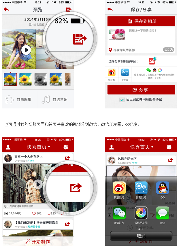 快秀的视频分享支持新浪和腾讯微博用户,你可以把精彩的视频分享给你的粉丝好友。