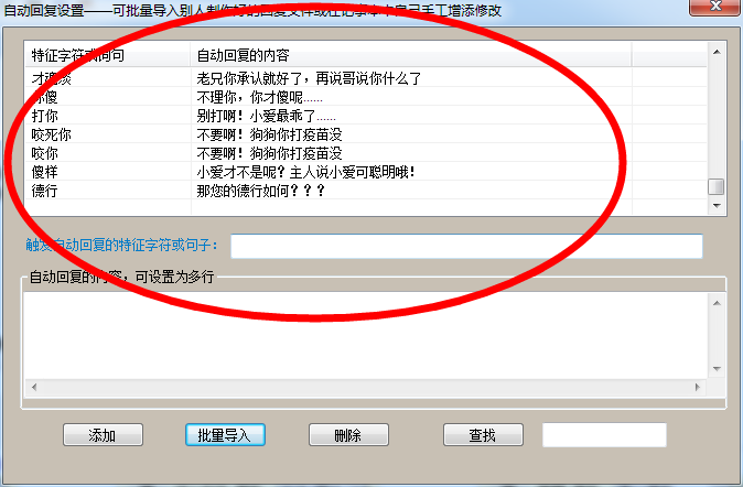 2、自动回复设置:可批量导入别人制作好的回复文件或在记事本中自己手工增添修改,点击批量导入。