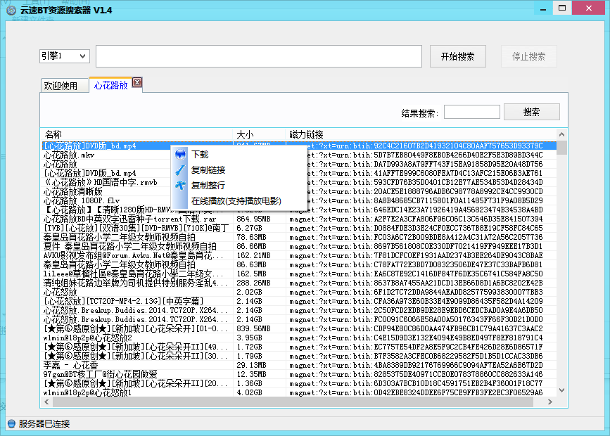 2、在搜索结果,选择任意资源,右键,可以进行下载、复制链接、复制整行、在线云点播(在线播放电影)等操作