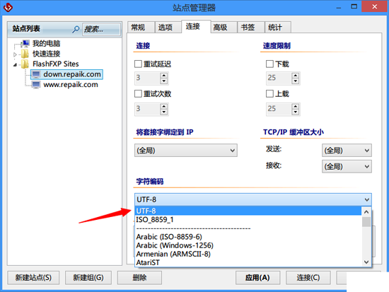 如果连接linux的服务器,简体中文乱码,请在站点管理器里面选择对应的站点,切换到连接标签,将字符编码由自动检测改为UTF-8
