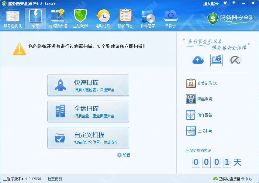 服务器安全狗2合1杀毒体验版新增杀毒、服务器优化功能,另外加入定时任务、软件管家,并且使用本版本还能直接调用云备份、服务功能,多方位保护你的服务器,让你的网站无懈可击!