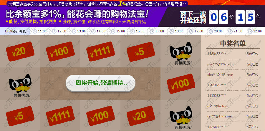 2014双十一天猫推出了充天猫宝抢红包的活动,用户充300就有机会抢到1111红包。充天猫宝抢红包,每天10:00整开抢,每个整点都有一次抢红包的机会,可以获得5-1111元不等的天猫红包。本款辅助就是专门用于帮你整点抢红包的脚本,全自动后台挂机,到点自动开抢,不占用内存。