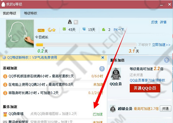 6、打开我的QQ等级,可以看到QQ勋章墙0.2天加速成功。