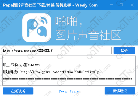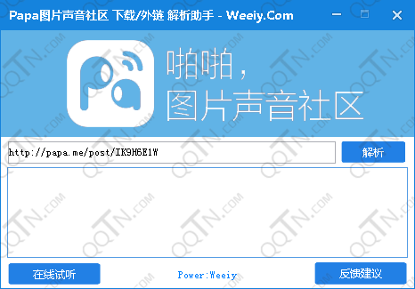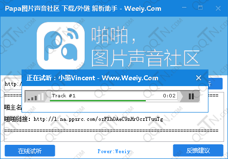 啪啪图片声音社区外链解析助手帮助你快速免费解析Papa图片音乐社区的各种图片声音的外链地址进行引用及下载。获取到的外链地址可以用于空间博客等地方。只需一个啪啪声音链接就能一键完成解析。
