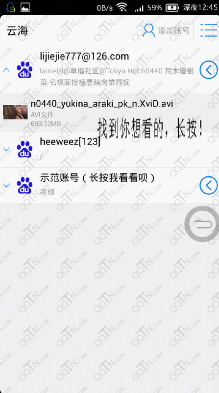 1、开启云海之后,点击添加账号,目前支持百度网盘、115网盘、360云盘三大网盘资源无缝互动浏览