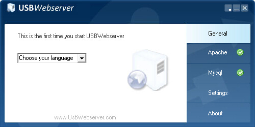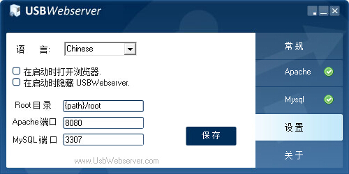 首次启动软件需要选择语言 (Chinese 为简体中文),然后你会发现 USBWebserver 运行后 “Apache” 和 “MySQL” 很快就显示了绿色的钩钩,表示它们已经成功启动好了。瞬间就能帮你一键搭建好 “Apache + PHP + MySQL” 环境。而且,你之前曾做的一切配置、网站代码、数据库什么的都会保留着。