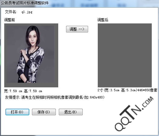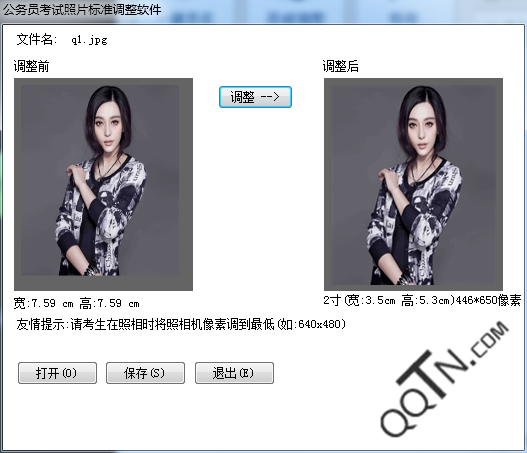 公务员考试照片标准调整软件其实就是一款标准的二寸照片生成工具,使用本工具能够将照片的尺寸生成标准的二寸大小3.5cm*5.3cm大小。傻瓜式操作,一键生成,无需借助其他图像处理软件缩放裁剪。
