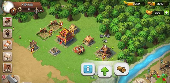进入天天撸三国后,我们首先看到的是自己的大本营,有主城、农田、锯木厂、兵营等建筑物,然后中间有一条和,把地图分成了两块。