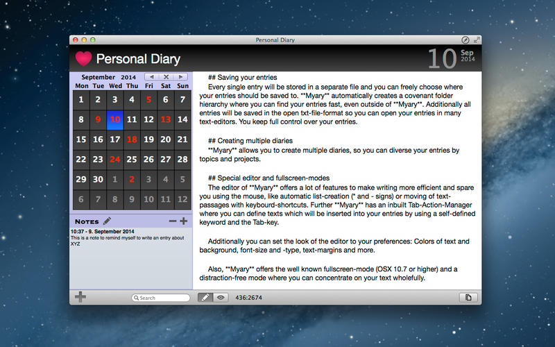 2、特殊的编辑器和全屏-模式。 Myary的编辑器提供了很多功能,使书写更高效,使用鼠标,如自动列表创建(*和 - 符号)饶你或文本的段落移动与键盘快捷键。此外,您可以设置编辑您的喜好的外观:文本和背景,字体大小和型,文字的利润率和更多的颜色。此外,Myary提供众所周知的全屏模式(OS X 10.7狮子和10.8山狮)和分心,自由模式,你可以专注于你的文字全。