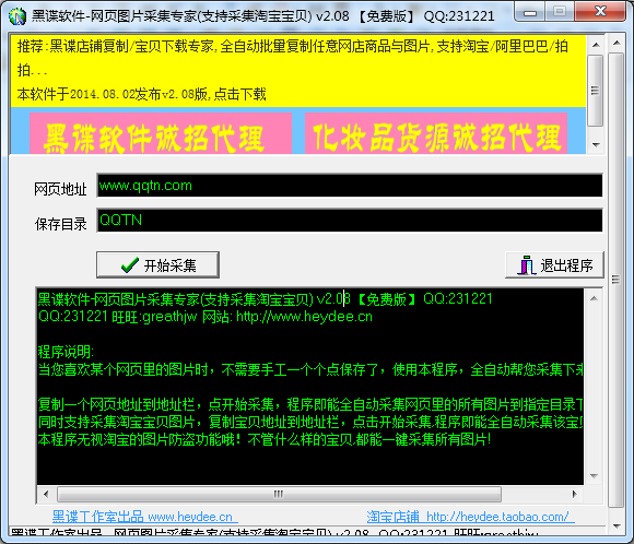 复制一个网页地址到地址栏,点开始采集,程序即能全自动采集网页里的所有图片到指定目录下。