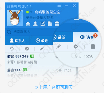 “我的访客”功能是赶集叮咚针对赶集发帖用户量身定做的推销功能,只要您在赶集发帖,您就可以收到访问您帖子的所有用户记录的提示,即使您客户端不在线,微信叮咚也可以帮您接收离线访客及消息,我们也会为您记录访客信息,以便您下次登录时查询。有访客浏览您的帖子时,您会收到如下提示: