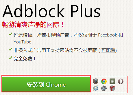 您只需将 Adblock Plus 安装到您的浏览器(支持 Firefox、 Chrome, Safari 和 Opera) 或是 Android 智能手机或平板电脑,所有的广告都将在您访问网页时自动去除。