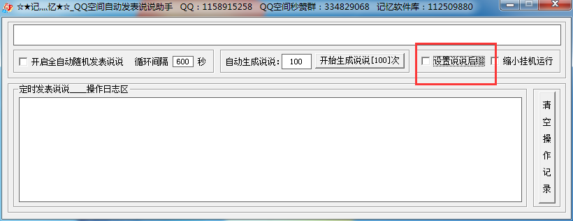 记忆出品,QQ空间说说自动发表助手,开启软件可以实现全自动发表随机说说,实现打造人气QQ空间的目的。同时还可以设置说说后缀。