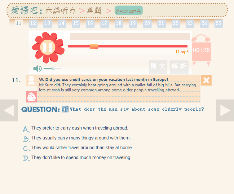 爱语吧英语六级听力,专为六级备考而准备,提供历年英语六级考试真题,为你提供详细的分析讲解;同时设定了多种练习方式,让你可以熟练掌握六级考试的答题方法,全力推进六级听力突破。