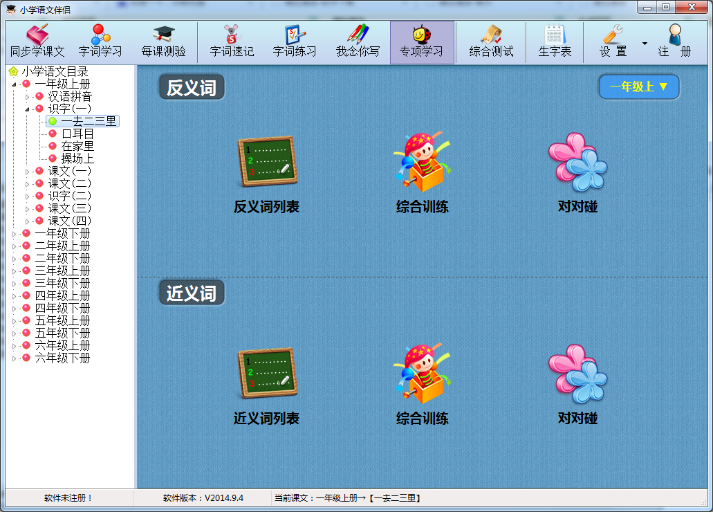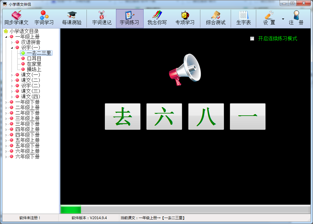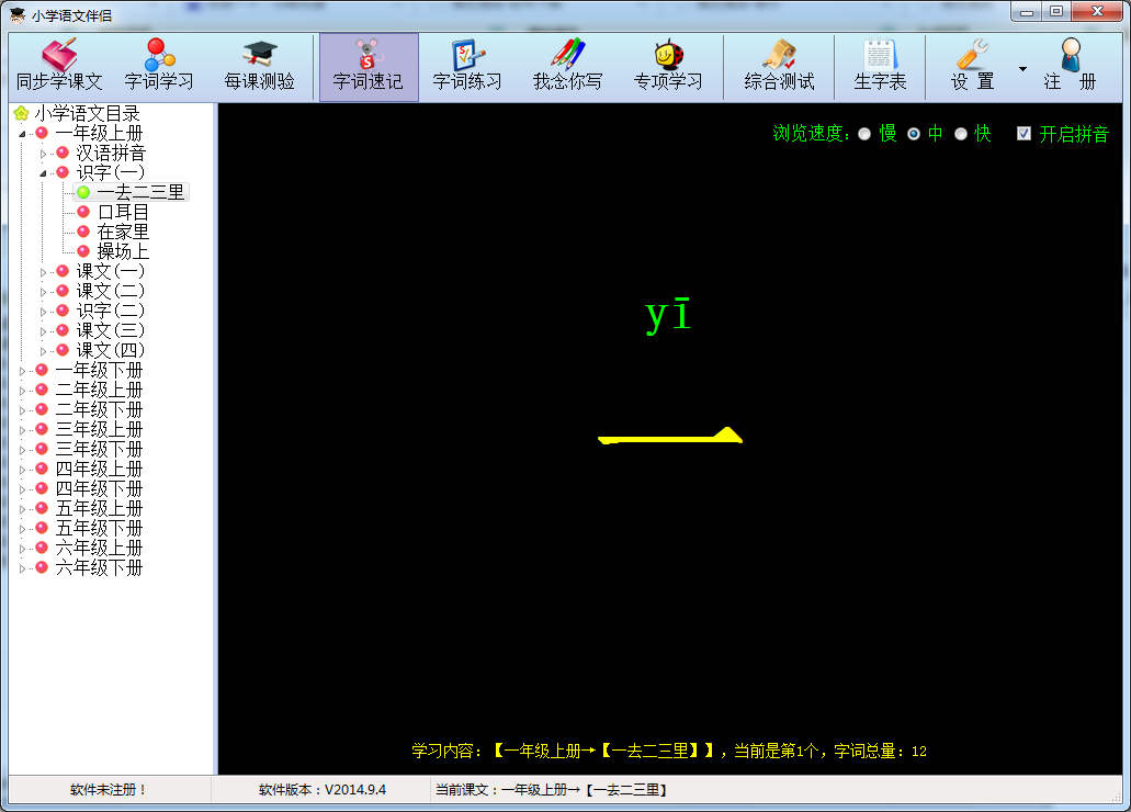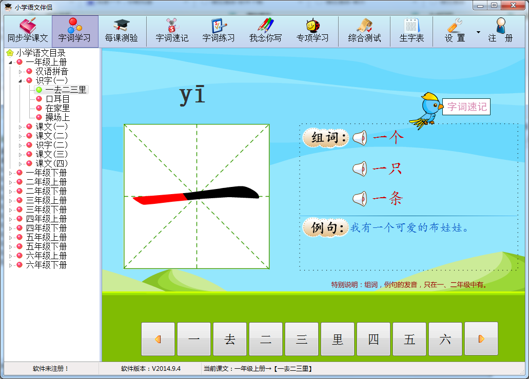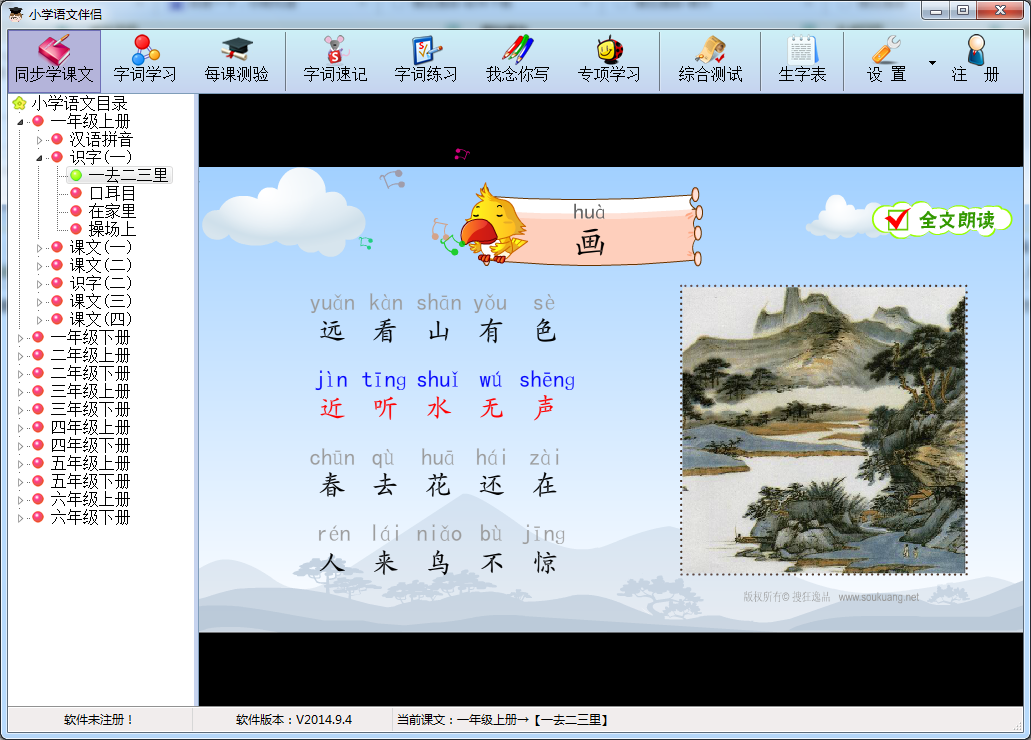 软件具体功能包括:同步学课文、字词速记、每课测验、综合测试、听音认字、看音认字、听音辨音、看字认音、我念你写、专项学习以及生字表!最新版中增加了手写功能,小朋友可以通过手写功能进行答题。