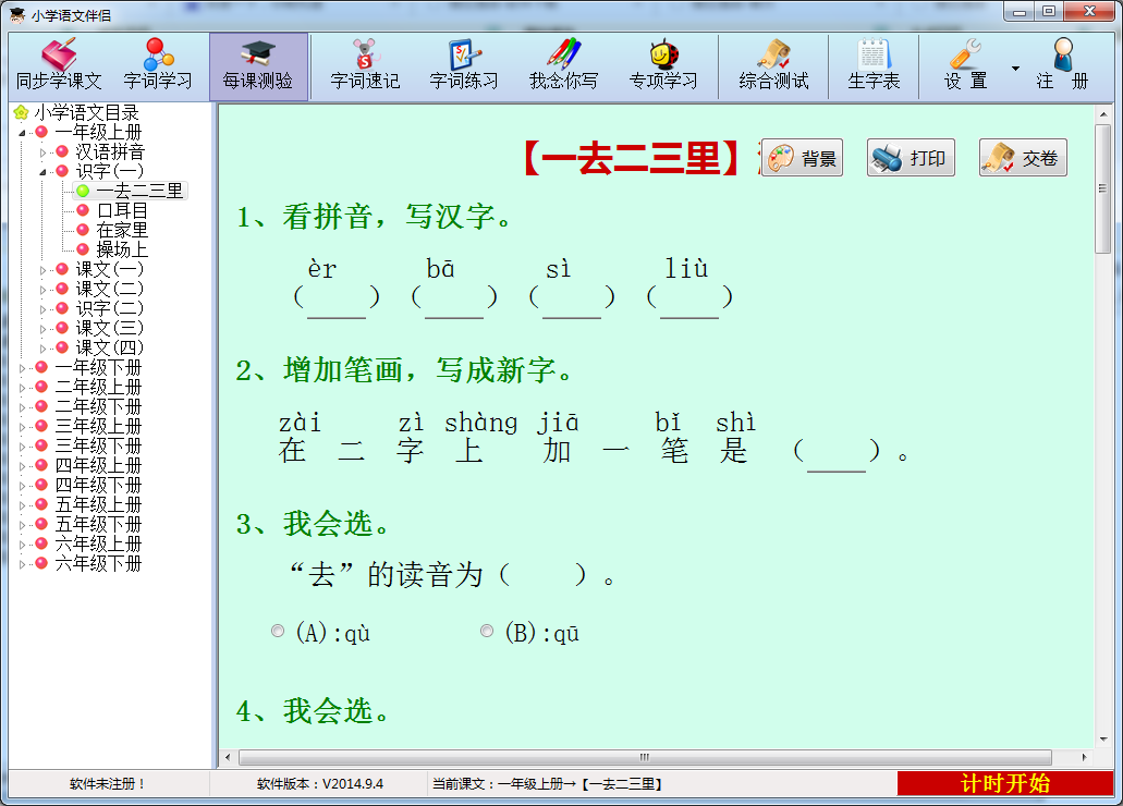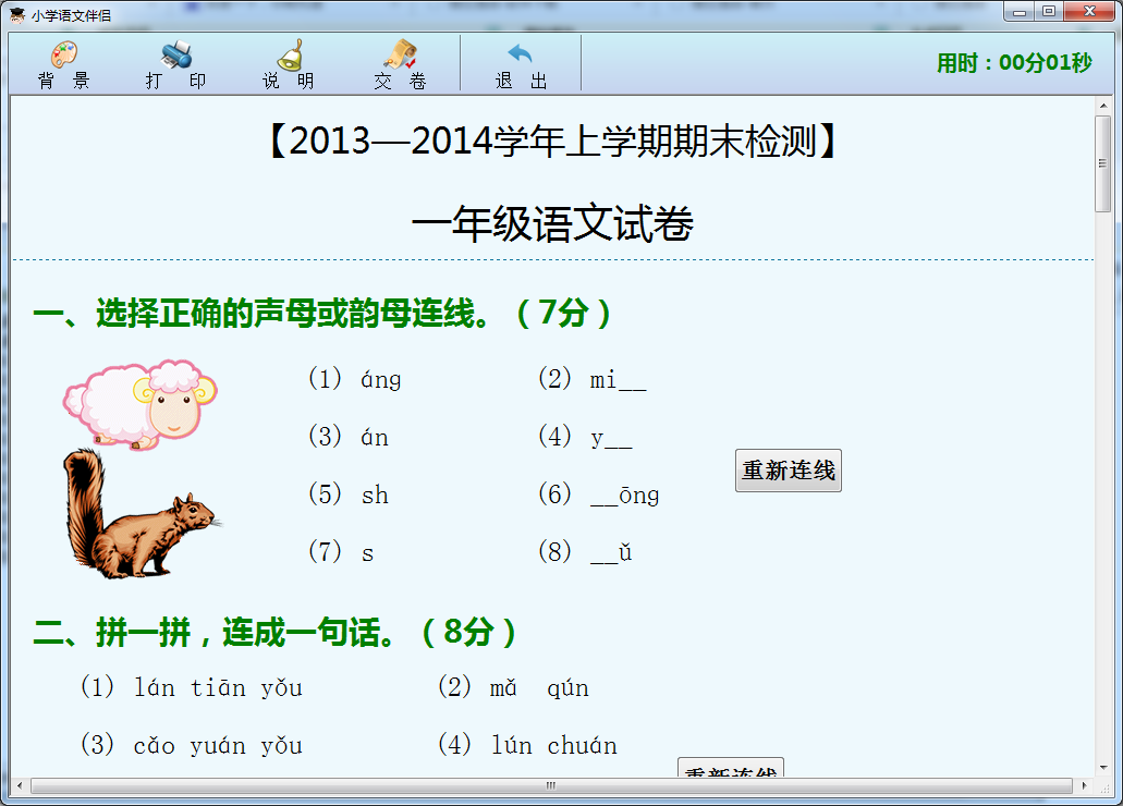 3 、软件中的每课测验题目类型丰富,内置鼠标手写输入功能,不会打字的小朋友可直接使用这个功能进行汉字输入,灵活方便。做完后可自动打分判卷,同时会显示正确答案,做对和做错的题目一目了然。测验可以在电脑上完成,还可以打印出来做,打印效果非常完美!试卷中的字体大小、背景颜色也可以自由设置,完全做到人性化!