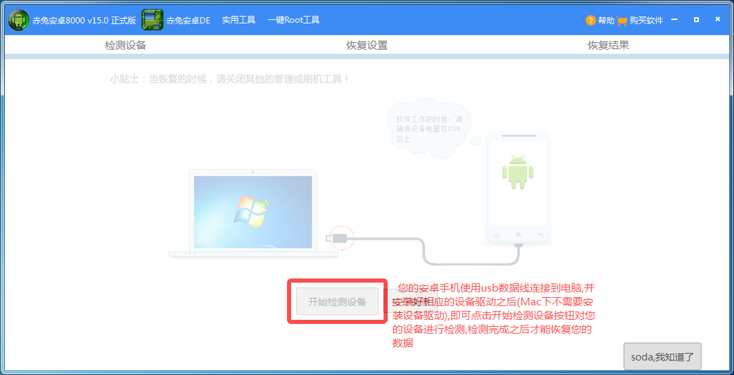 2、即可点击开始检测设备按钮,对您的设备进行检测,检测完成之后才能恢复您的数据。