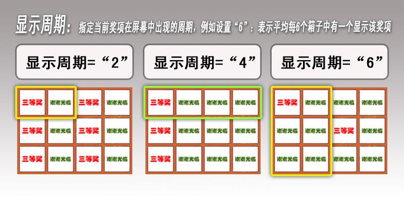 “显示周期”:设置当前奖项在所有抽奖单元中(彩蛋或箱子)的出现频率,请参考下面说明: