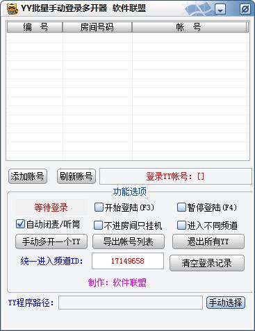 YY批量手动登录多开器是一款YY辅助工具,它可以帮助你进行YY多开,支持登陆所有YY账号并进入统一指定频道,自动进频道,这款软件操作十分简单,它可以自动关闭声音和麦克风,同时还有一键退出所有YY账号等功能,欢迎下载使用!