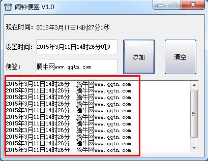 2、信息将会在列表框显示,当所定时间与系统时间相一致时,软件会弹出信息框,提示信息为所填便签。