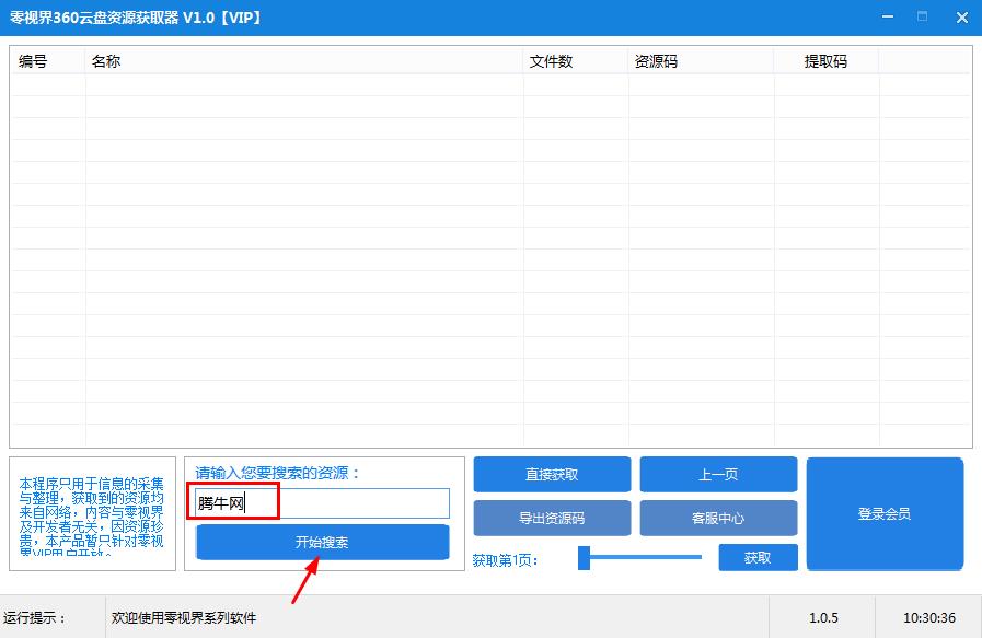 1、打开零视界360云盘资源获取器,在软件界面下方,输入需要搜索的关键词,点击【开始搜索】