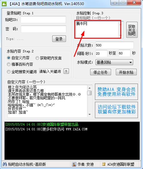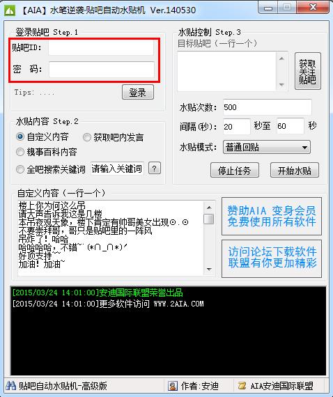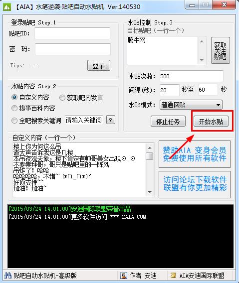 水笔逆袭贴吧自动水帖机是一款专门针对百度贴吧制作的自动水贴工具,这款软件可以帮助你自动回帖,包括普通回帖和楼中楼回帖两种水贴模式,这款贴吧自动水帖机绿色小巧,免费使用,你只需要登陆贴吧账号,选择目标贴吧,设置好水贴内容和水贴次数、频率它就能帮你自动水贴了,欢迎下载使用!