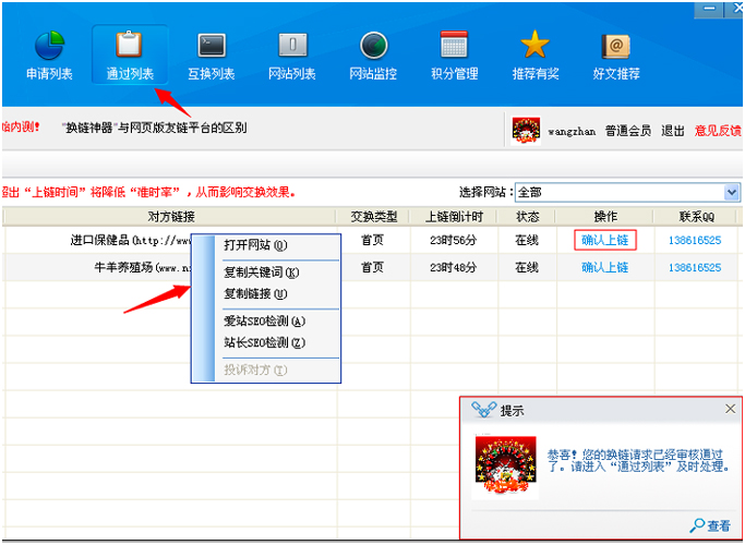 第五步:待对方同意后,您所登陆客户端也会收到一个提示窗口,点击“查看”会客户端会跳转至“通过列表”在这里您可以的按对方互换的关键词和网 址进行添加友情链接,然后点击“确认上链”(关键词和网址可以直接在相应列表上右击进行复制粘贴操作)