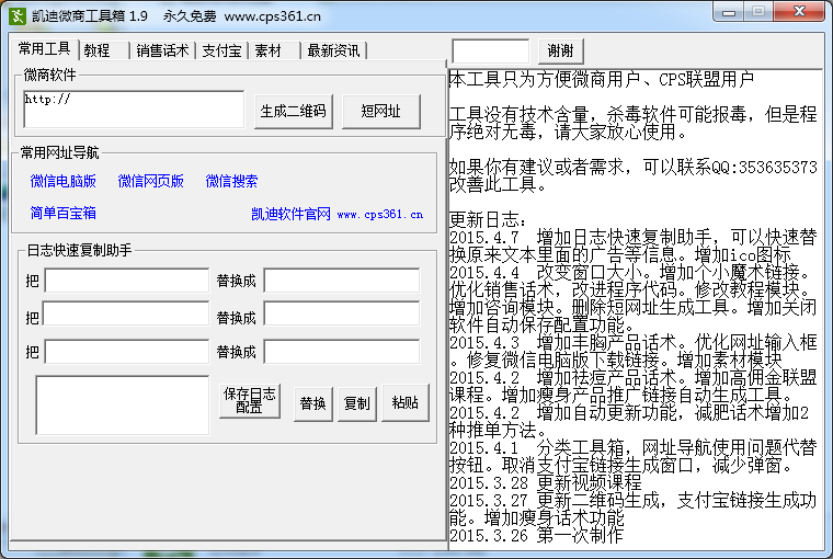 2015.4.4 改变窗口大小。增加个小魔术链接。优化销售话术,改进程序代码。修改教程模块。增加咨询模块。删除短网址生成工具。增加关闭软件自动保存配置功能。