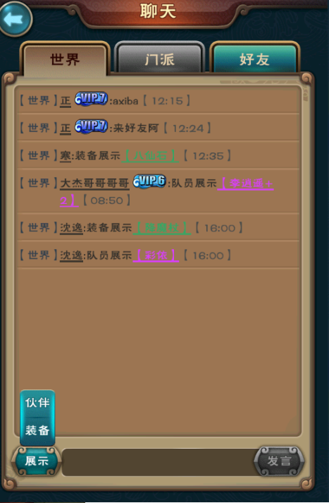 聊天:点击后可以进入聊天界面,可以和朋友私聊也可以和大家“群P”,还能展示自己装备以及小伙伴。