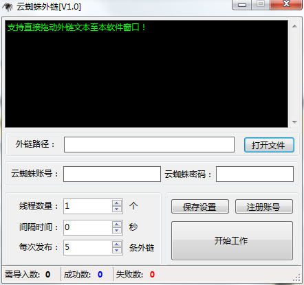 云蜘蛛外链工具是一款免费的外链推广软件,这款软件绿色小巧,可以帮助你将大量的长尾关键字利用大型平台推送到百度进行收录与排名,通过百度云蜘蛛程序用户可以在短时间内将大量包含广告信息的页面推送到互联网中。并且这一切都是全自动化完成。