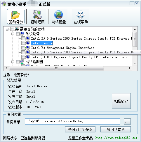 驱动小帮手是一款电脑驱动管理软件,软件提供驱动备份、驱动还原、网络硬盘等功能。用户可以使用本软件将驱动备份到本地或是网络硬盘。同时软件还可以查看每一个驱动的详细信息,包括驱动名称、生产厂商、发布厂商、发布日期、驱动版本等信息。