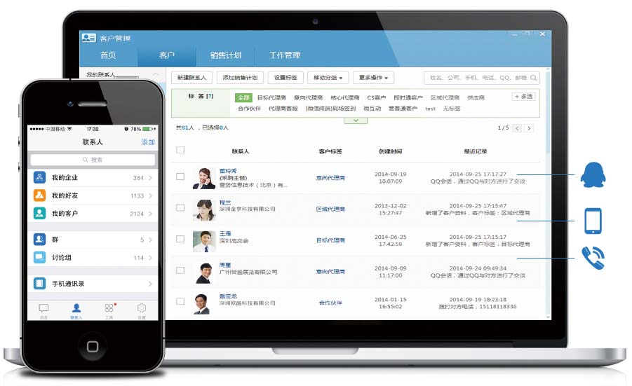 销售人员可以用QQ 、微信、电话、短信、邮件等沟通工具随时与客户互动,保持紧密沟通。