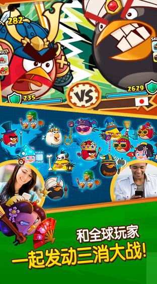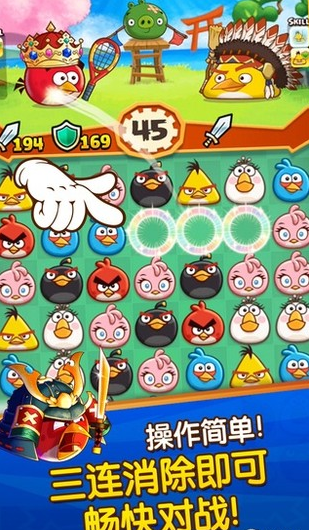 玩法超级简单,不论纵向或横向,只要凑齐三个以上相同的“愤怒的小鸟”即可消除。在时间限制内尽可能消除更多来打击对手。通过武器或帽子等来装备愤怒的小鸟。这些装备可以使愤怒的小鸟威力大增,让你占得先机。一边对战一边获得装备,说不定还能获得稀有物品。