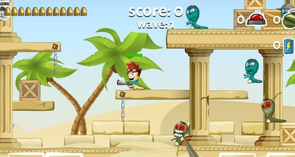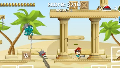 作为一款射击游戏,游戏采用了传统的横版表现形式,而且场景只有一个,没错,只有一个场景,我们在沙漠遗迹里消灭一拨又一拨的僵尸虫虫,画面整体基调偏明亮,风格也比较活泼,虽然家园都被摧毁了,但不知道为什么主角从头到尾都在笑,虫虫的装扮也是非常奇葩,牛仔围脖加上挡风眼镜,十分酷炫,而僵尸就比较惨了,全都是一副未发育完全的体态。