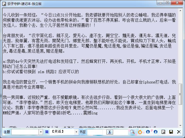云子守护速记本是一款由云子守护官方推出的一款快速记事本软件,它能帮助你进行日常记事,自定义主题分类、书签、段落,支持多篇文章速记,还支持导出备份、全屏浏览、格式复制,另外它的主题还可以跟随光标移动而变化,非常方便好用,欢迎各位喜欢记笔记的朋友们下载使用!