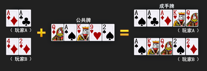 上图中,玩家A的成手牌有三条,玩家B有一对,根据比牌的规则,三条大于一对,所以玩家A胜出。