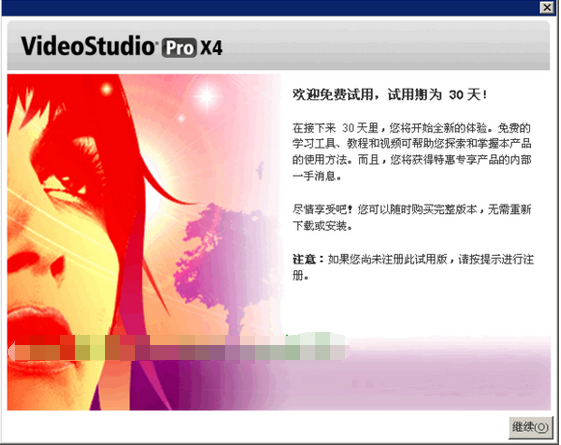 2、安装成功之后,运行会声会影x4,点击继续