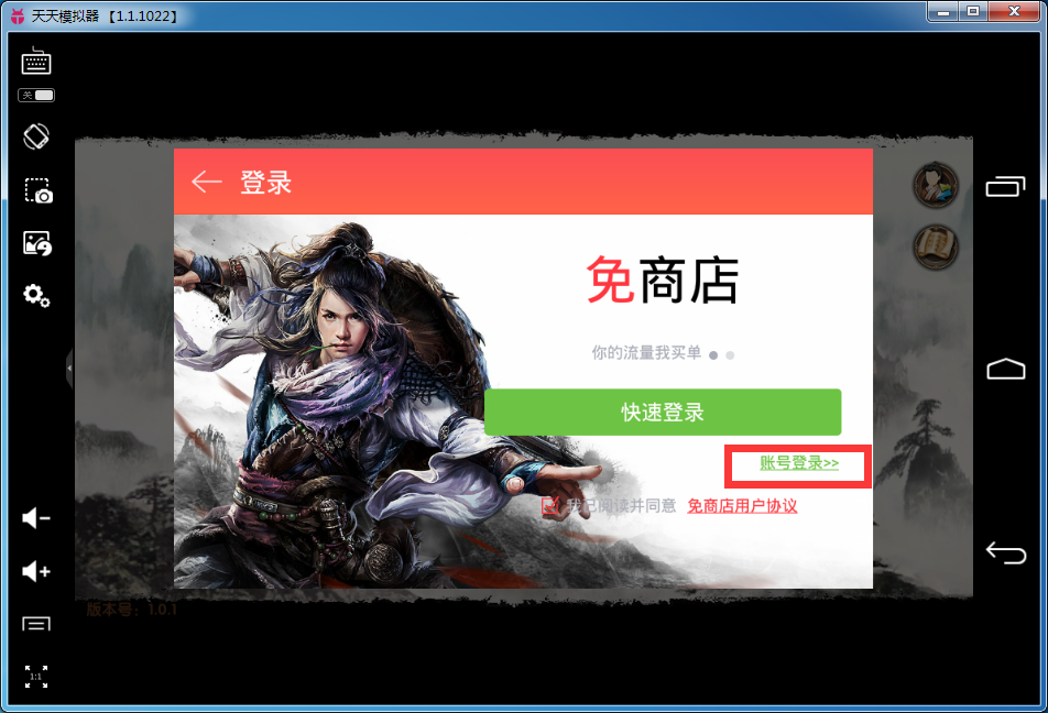 3、当你下载安装好《九阴真经手游》之后,点击进入游戏,提示需要登录帐号,可以直接使用免商店帐号登录,如果没有,点击使用帐号注册。