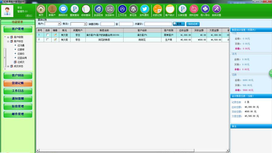 轻客通客户管理软件是一款专为中小型企业推出的客户管理系统,这款软件是面向新一代CRM社会化、移动化、云端化的CRM管理软件,它主要面向低端客户,为中小微型企业提供低成本、高效益的客户信息化解决方案。功能全面、操作简单、升级方便、拥有较强的安全性、稳定性、易用性!